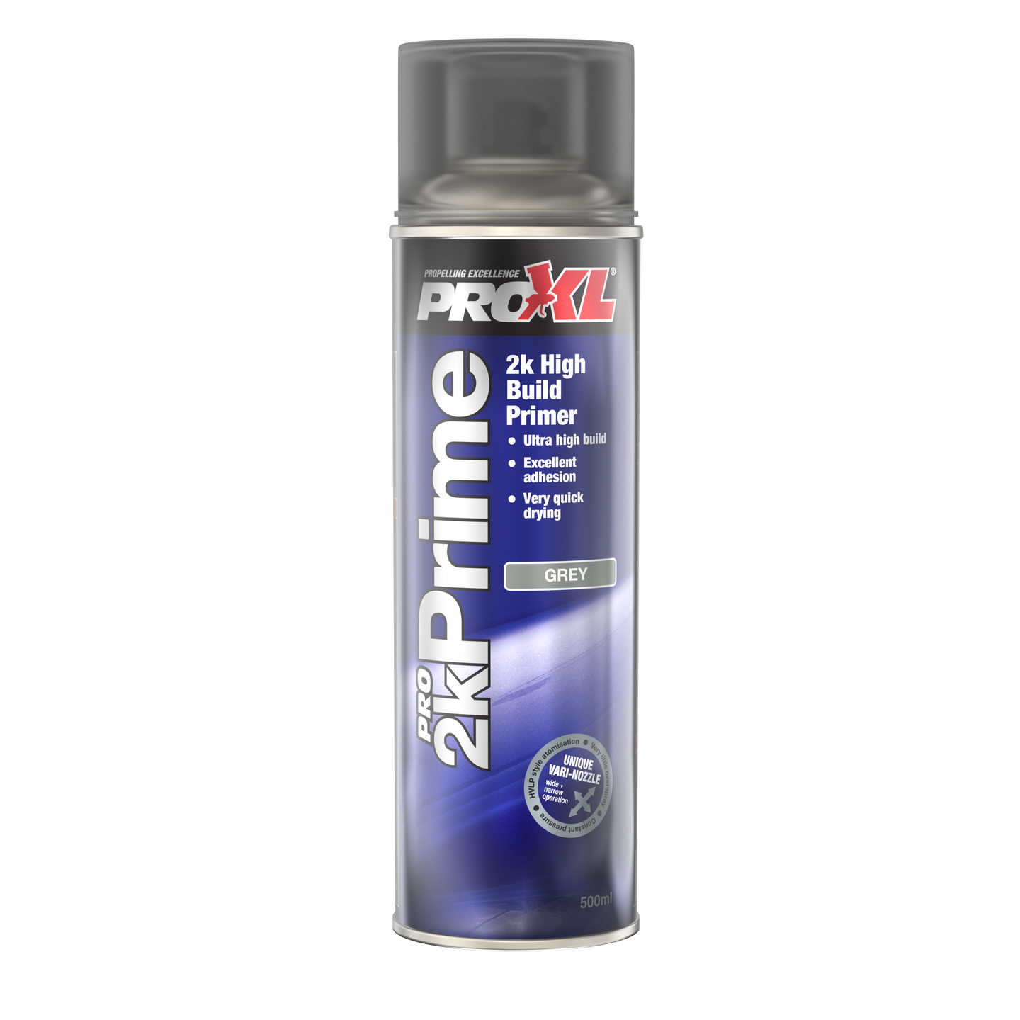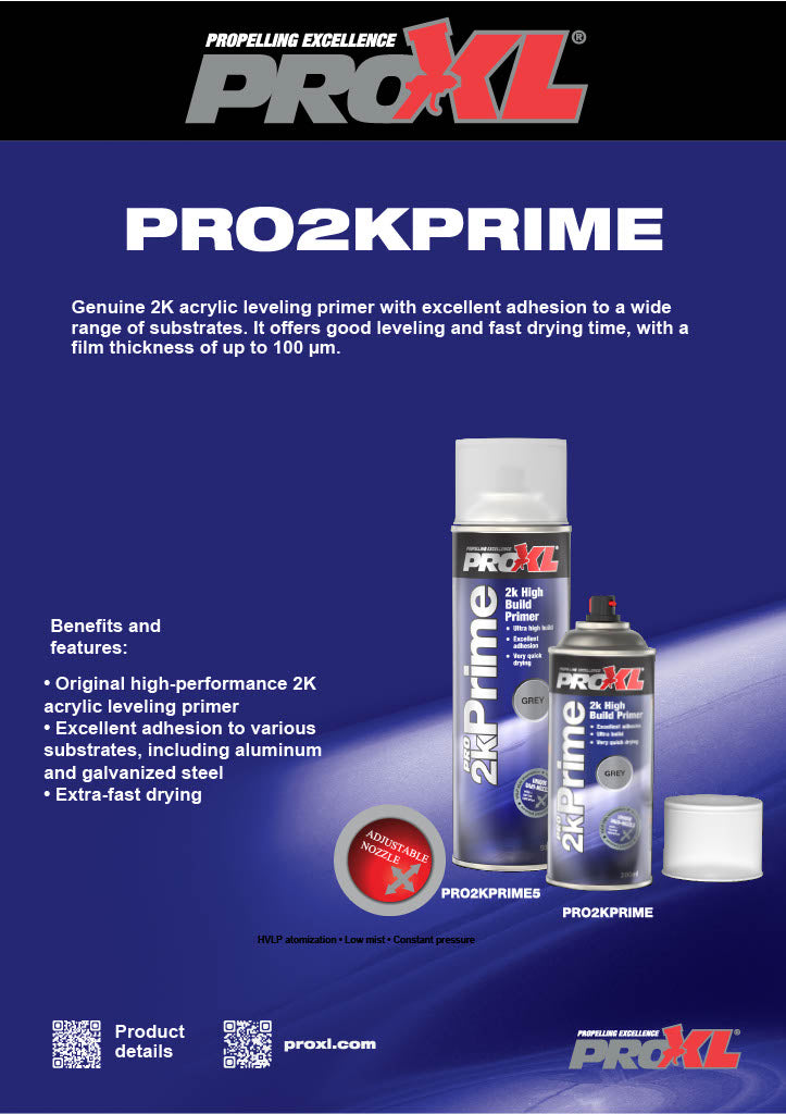 A high build primer utilising 2K aerosol technology. This 2k primer can be applied to a wide range of substrates with outstanding adhesion and sealing properties. Pro2kPrime is also very quick drying, and is isocyanate free. Supplied with the unique Vari-nozzle, giving the user a choice of spray pattern for flexibility.